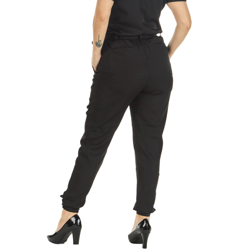 A Calça Punho Scrub possui um design prático, feito em tecido alfaiataria composto por 90% poliéster e 10% Elastano, fibra sintética que permite secagem rápida e não amassa facilmente. Modelo jogger com cinto e punho na barra, fechado com botão de pressão prateado. Na frente possui fechamento em zíper e botão, e bolsos faca. Na parte de trás, possui elástico no cós para melhor ajuste ao corpo e bolsos alfaiataria com vista.