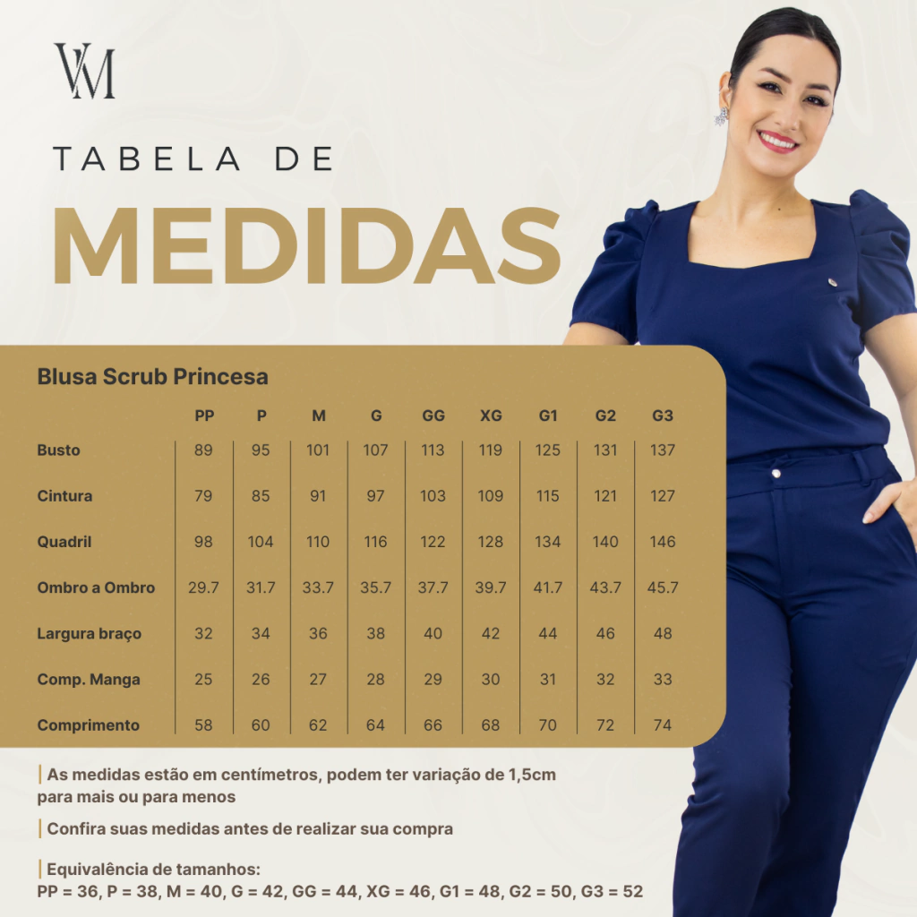 A Blusa Scrub Princesa possui um design pensado para ser prático, feito em tecido alfaiataria composto por 90% poliéster e 10% elastano, fibra sintética que permite secagem rápida e não amassa facilmente. Sua modelagem é estruturada e acinturada com manga curta semi bufante. O modelo permite maior mobilidade para trabalhar, proporcionando funcionalidade, conforto e praticidade sem perder o estilo.