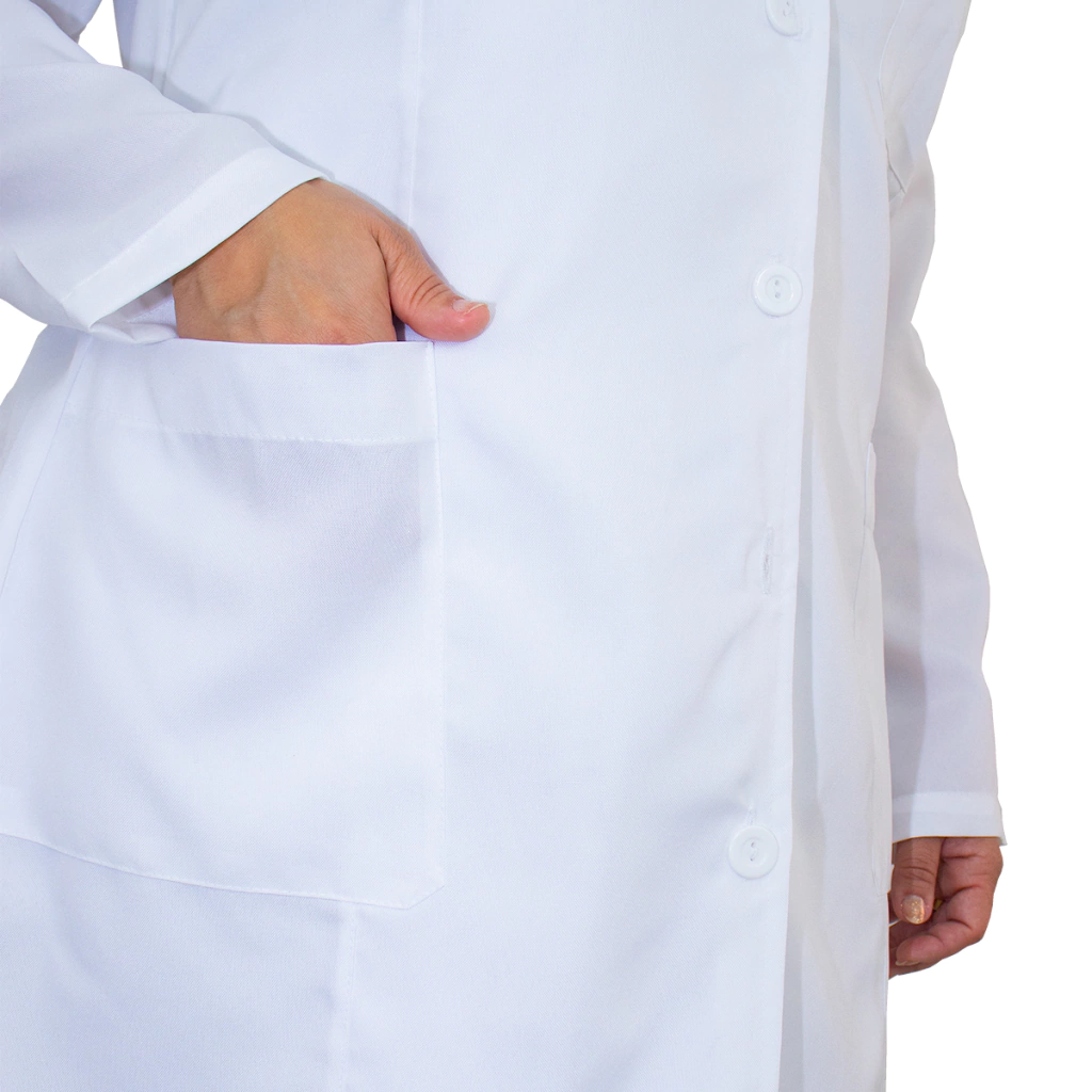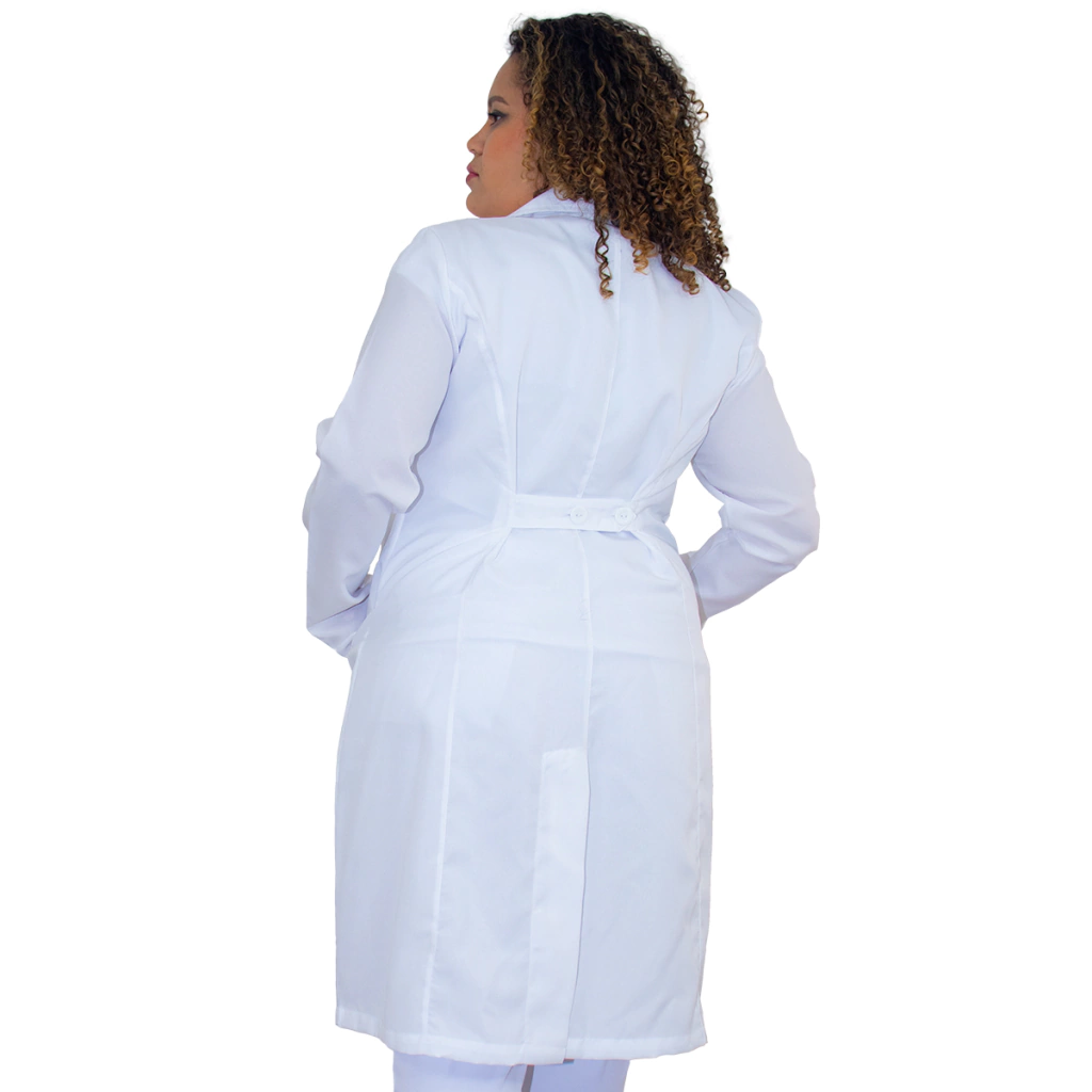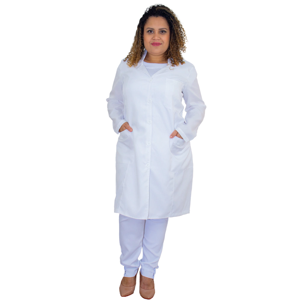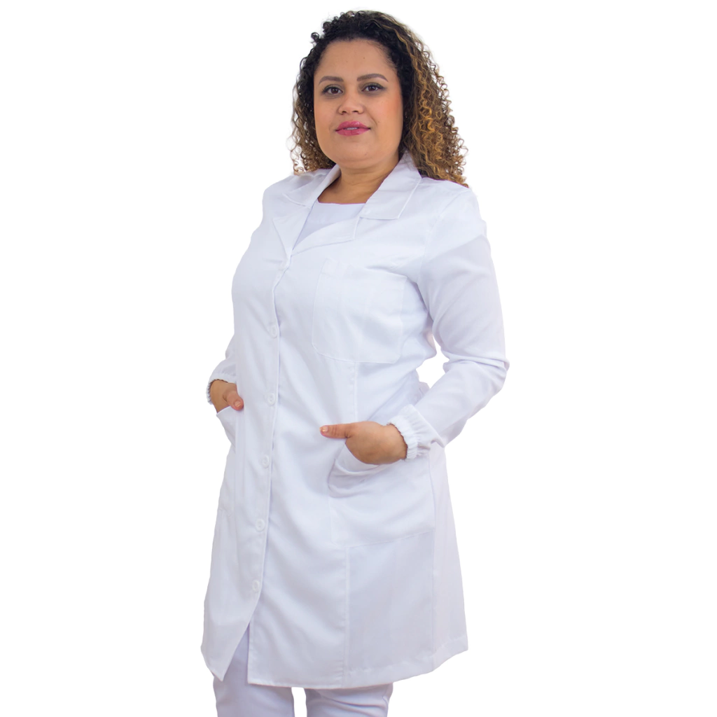 O Jaleco Feminino é confeccionado em tecido 100% poliéster, disponível na cor branca, com fechamento em botões e 3 bolsos frontais, sendo um superior lado esquerdo e dois inferiores.