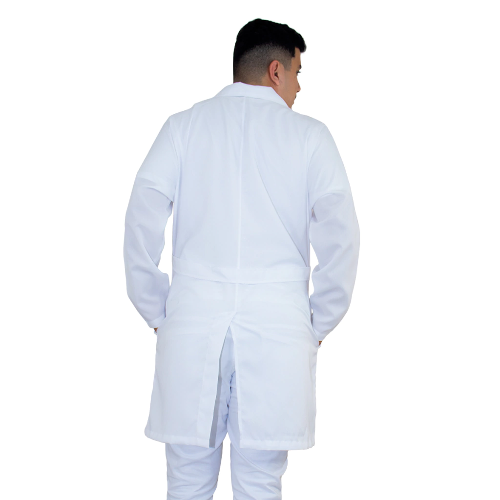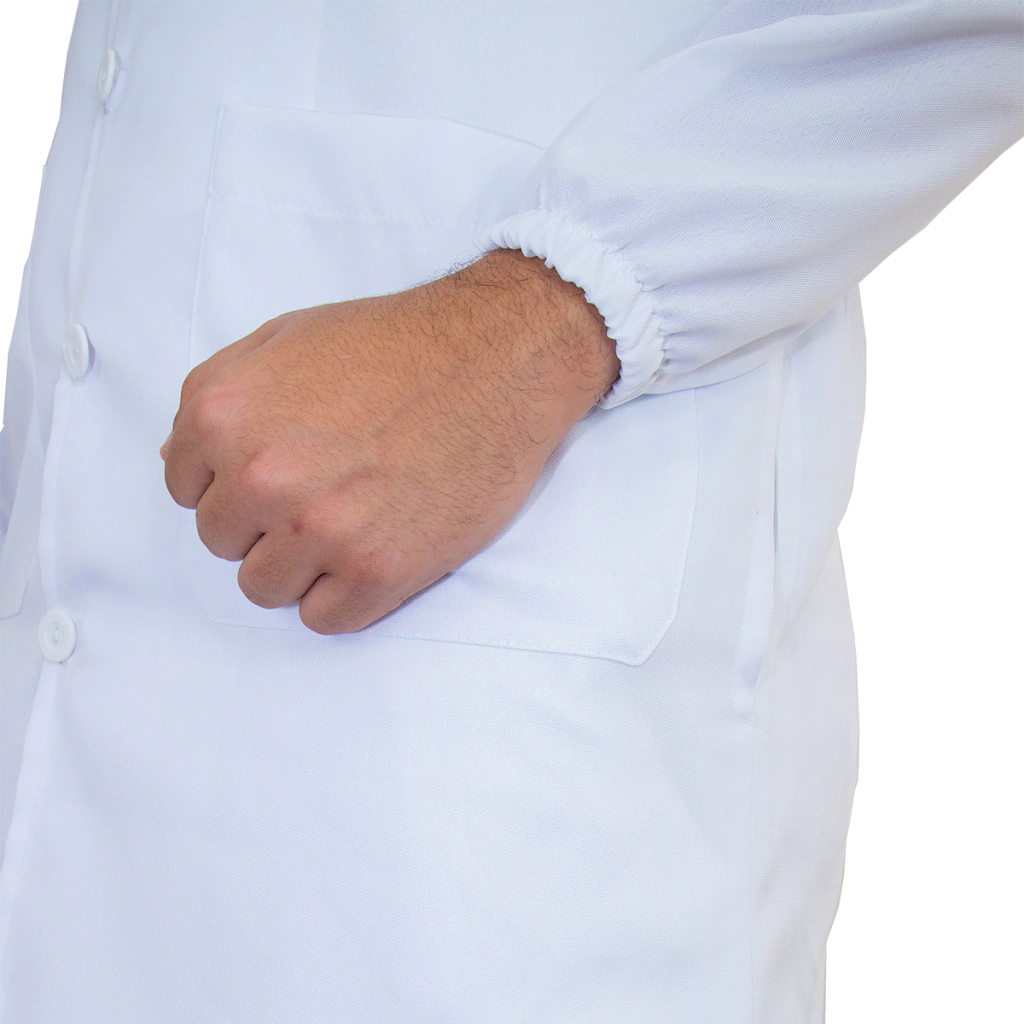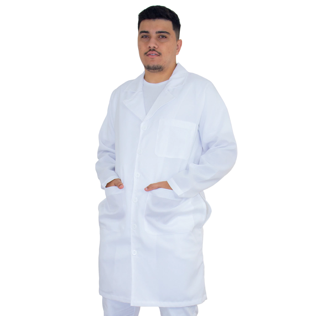 O Jaleco Masculino é confeccionado em tecido 100% poliéster, disponível na cor branca, com fechamento em botões e 3 bolsos frontais, sendo um superior lado esquerdo e dois inferiores.